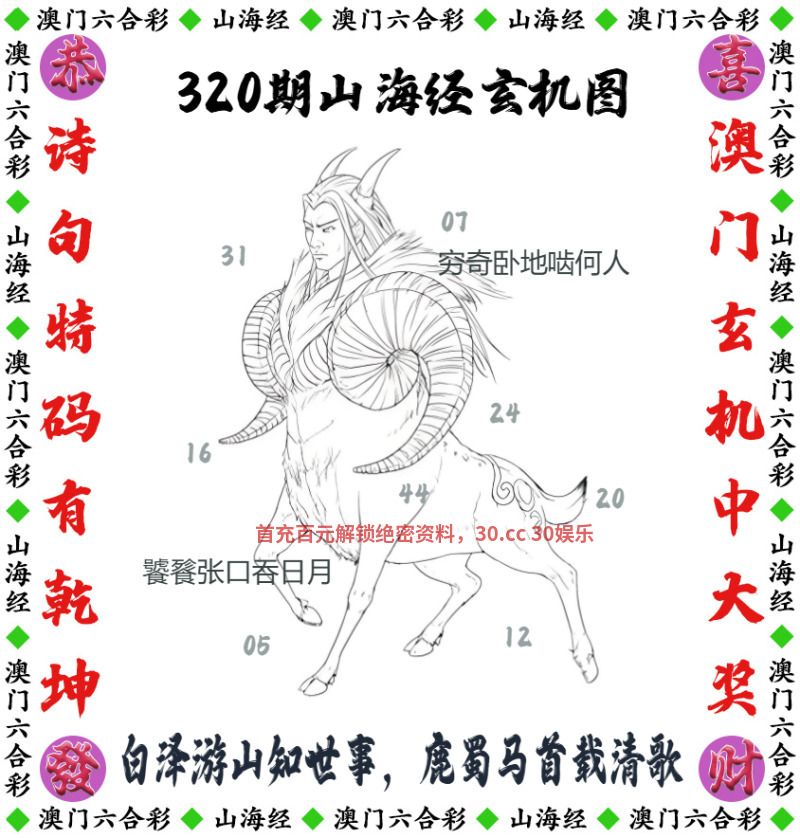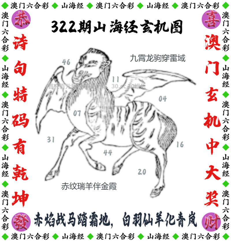 322期:【山海经玄机】开羊47 解释:九霄龙驹穿雷域,赤纹瑞羊伴金霞解狗羊兔 解料:赤焰战马踏霜地,白羽仙羊化青岚解虎猪马 综合:狗虎猪马羊兔 主特:20.44.04.16.07.31.12.24.11.47.03.15 |