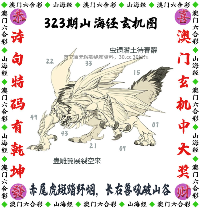 323期:【山海经玄机】开鸡09 解释:虫遗潜土待春醒,蛊雕翼展裂空来解猪鸡狗 解料:赤尾虎斑踏野烟,长右兽吼破山谷解马羊牛 综合:猪鸡马羊牛狗 主特:07.43.09.21.24.48.11.47.05.41.08.44 |