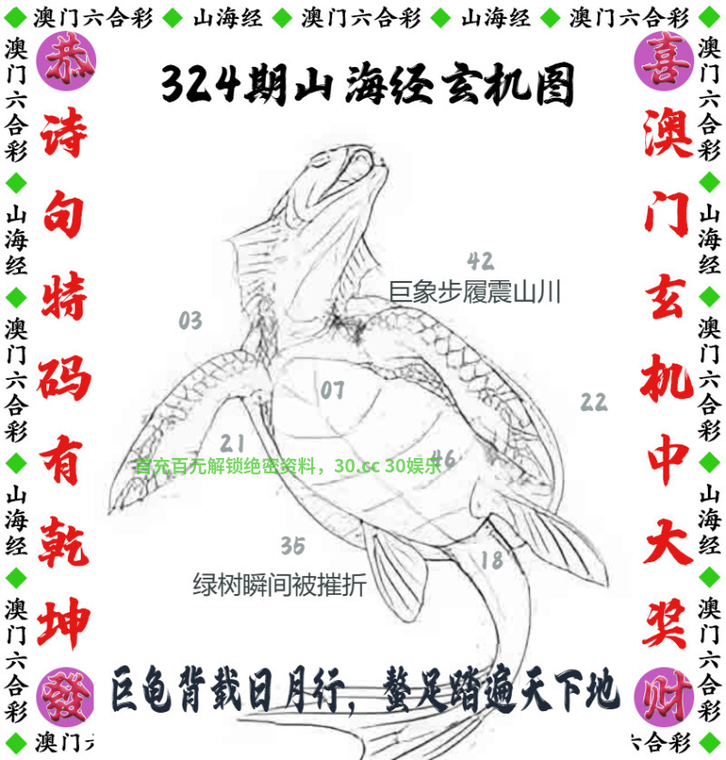 324期:【山海经玄机】开兔15 解释:巨象步履震山川,绿树瞬间被摧折解鼠猴蛇 解料:巨龟背载日月行,螯足踏遍天下地解龙兔虎 综合:鼠猴龙兔虎蛇 |